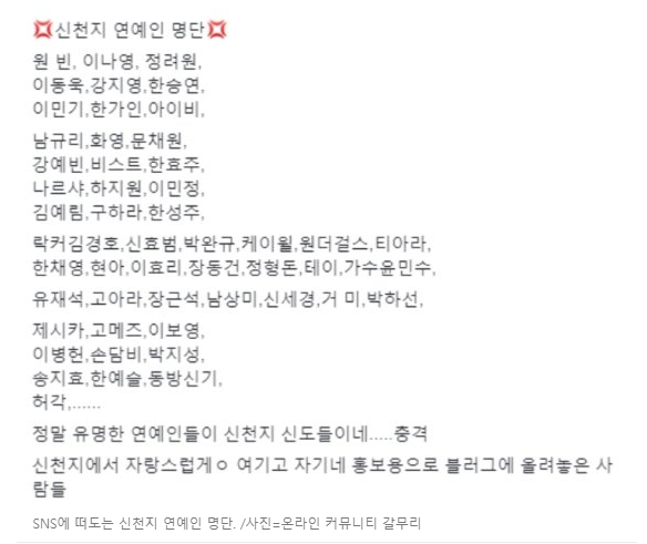 루머의 근원지로 알려진 블로그 이용자는 연예인들의 이름을 나열한 뒤 "이 사람들이 진짜 신천지일까요? 물론 확실하지 않다. 제가 좋아하는 연예인들 나열한 것이다"라고 적었다.