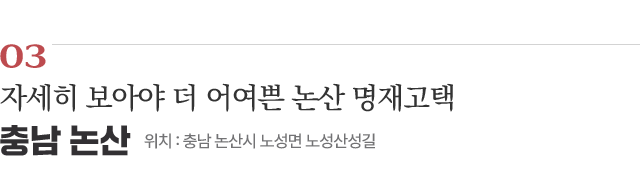 논산 명재고택(국가민속문화재)은 평생 벼슬을 사양하고 학문 연구와 후대 교육에 전념한 조선 대학자 명재 윤증의 집이다. 고택은 안채와 광채(곳간채), 사랑채, 사당으로 구성된다. 보존 상태가 양호한 조선 양반 주택의 가치에 실용성과 과학적 원리가 돋보이는 한옥으로 꼽힌다. 미닫이와 여닫이 기능을 합친 안고지기를 활용한 사랑채, 일조량과 바람의 이동을 고려한 안채와 광채 배치 등 선조의 지혜가 돋보인다.