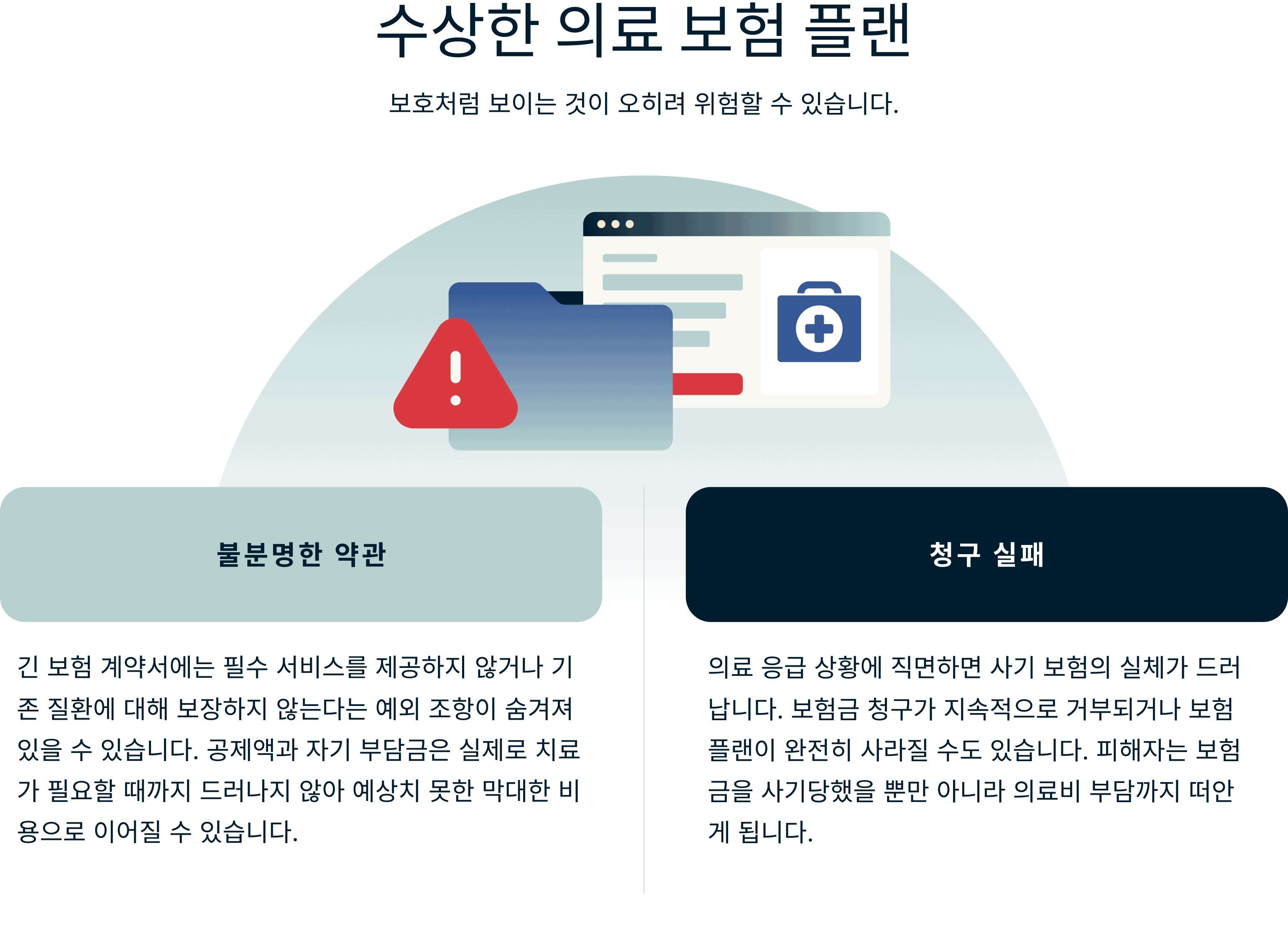 가짜 의료 보험 플랜은 안전하다는 착각만 제공할 뿐입니다. 저렴한 가격으로 종합적인 보장을 약속하지만 실제로는 막대한 의료비 청구와 잠재적인 법적 문제에 노출될 수 있습니다.