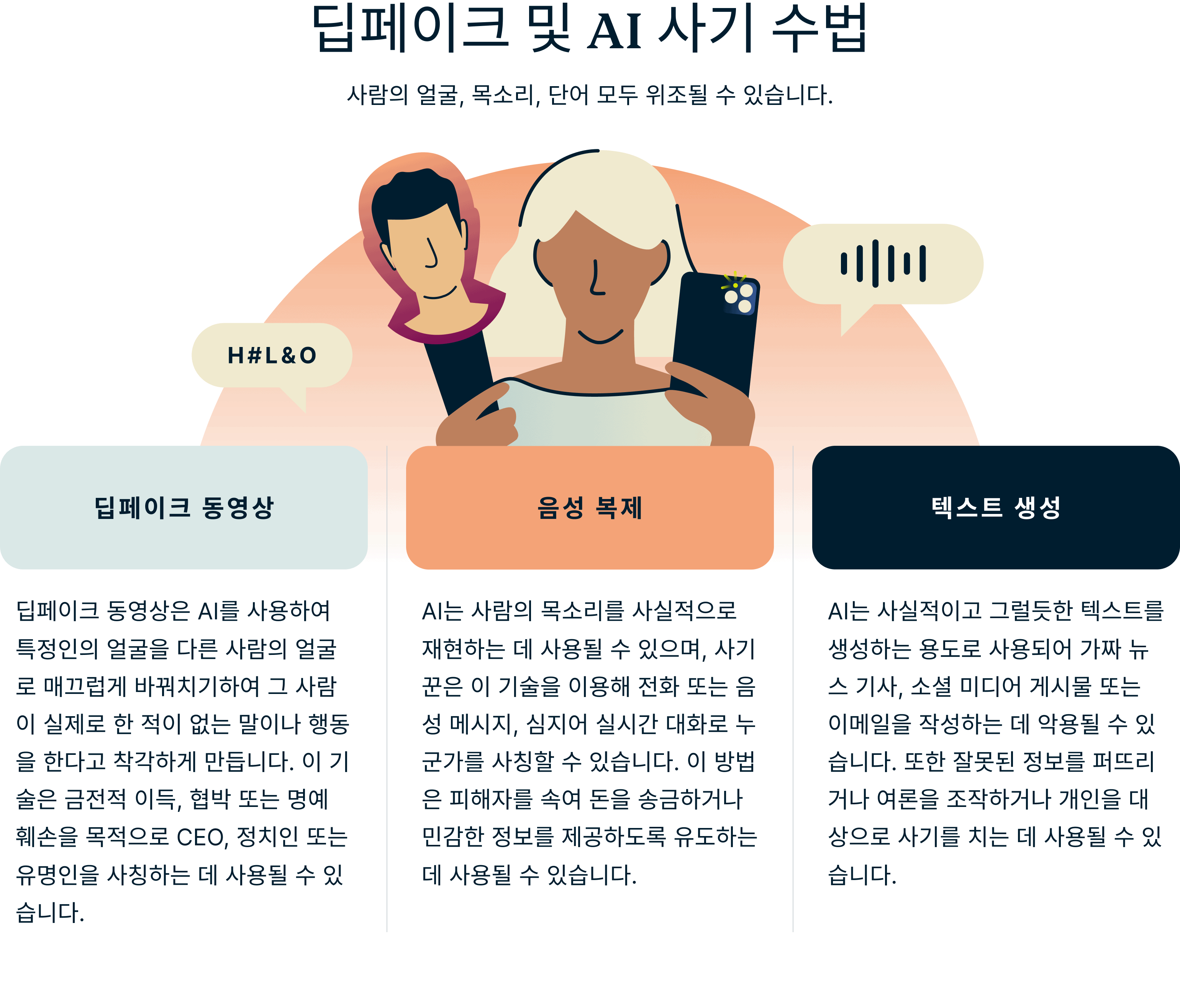- 딥페이크 식별 방법 알아보기: 많은 딥페이크가 꽤 진짜처럼 보이지만, 딥페이크를 식별할 수 있는 방법이 있습니다. 시각적 단서로는 피부 톤 및 그림자의 불일치, 흐릿하고 왜곡된 얼굴 부위과 같이 얼굴 특징이 조화롭지 않은 경우 등이 있습니다. 청각적 단서로는 자연스러운 억양이나 감정 표현의 부족, 갑작스러운 말 끊김과 같이 단조롭거나 로봇 같은 억양 등이 있습니다.
