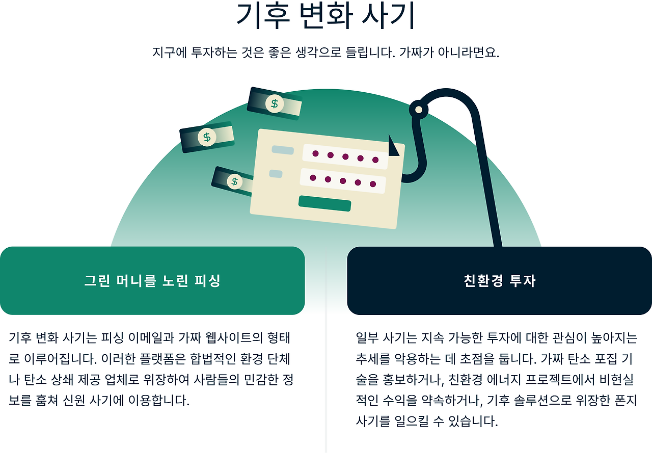 전 세계가 직면한 시급한 과제인 기후 변화는 안타깝게도 사기꾼들에게 좋은 먹잇감이 되고 있습니다. 사기꾼들은 사람들의 불안감과 문제 해결에 동참하고자 하는 열망에 편승하여 친환경 활동을 가장한 교묘한 속임수를 짜냅니다.