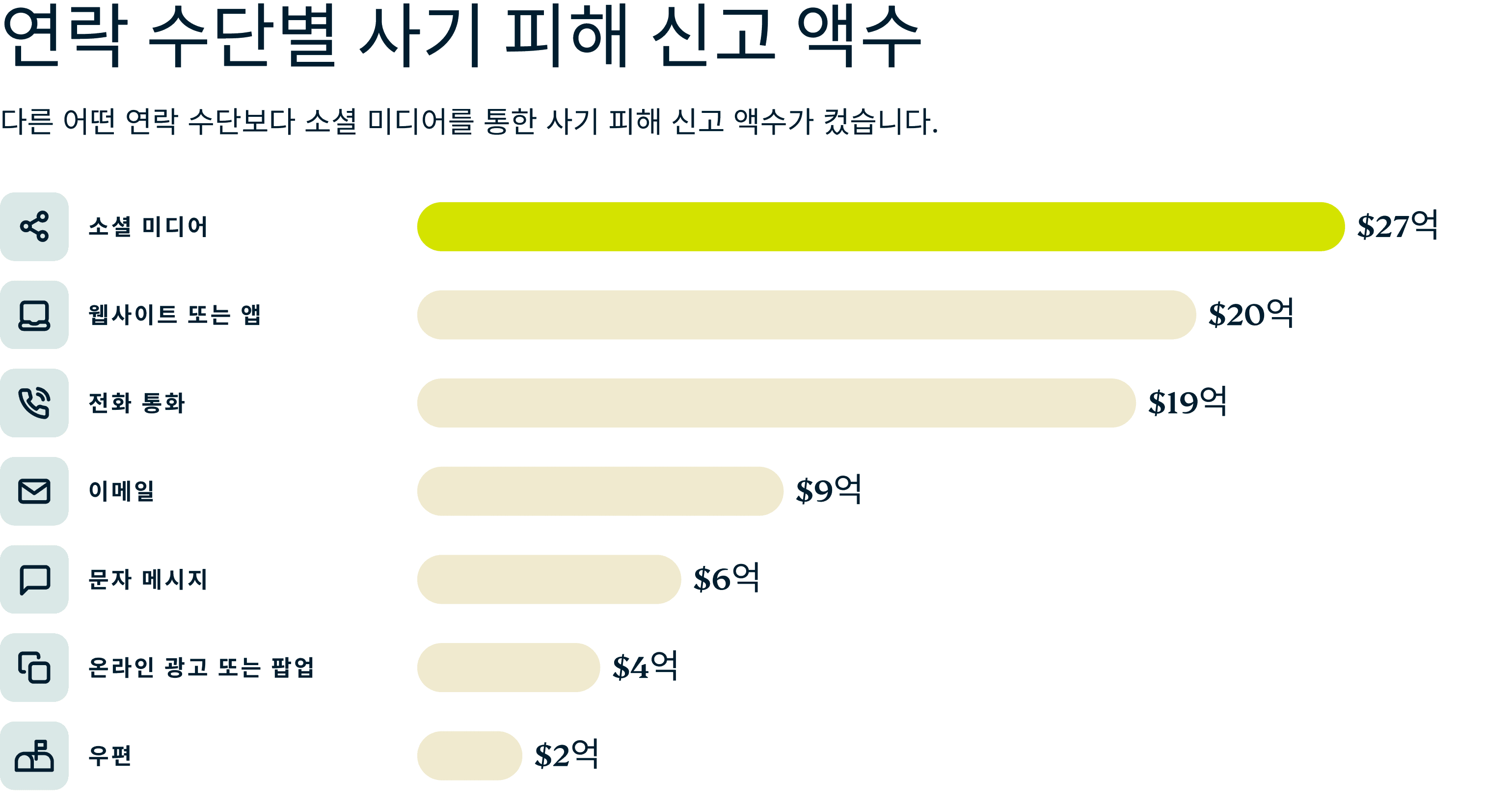 가장 많은 사기가 일어나는 수단에 무엇이 있을까요? 조사 결과, 소셜 미디어는 2023년에 미국인들이 사기로만 27억 달러의 손실을 입는 사기 활동의 온상지였습니다. 사기꾼들은 이러한 SNS 플랫폼을 점점 더 많이 활용하고 있으며, 플랫폼이 제공하는 신뢰와 광범위한 파급력을 악용하여 순진한 피해자들을 미끼로 삼고 있습니다.
