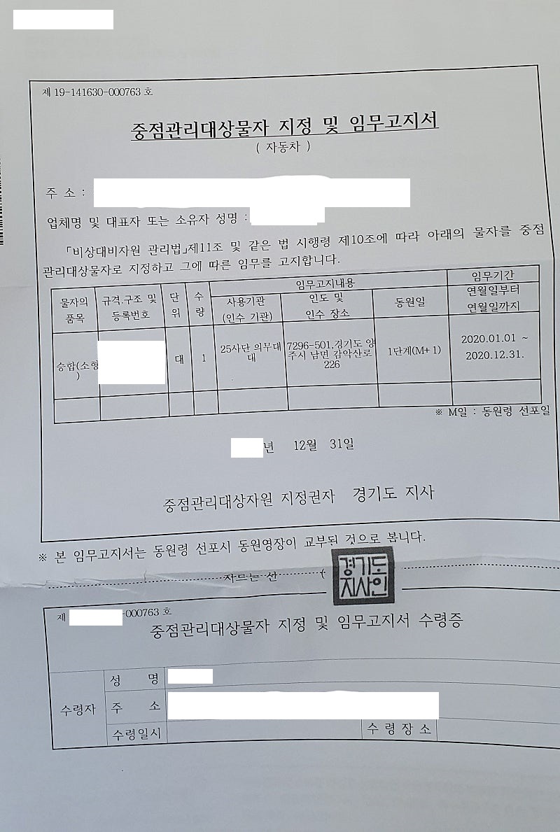 모든 SUV 차량이 '중점관리대상물자 지정 및 임무고지서' 를