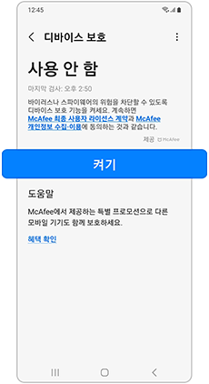그리고 McAfee와 삼성에서 악성 소프트웨어 또는 의심스러운 활동이 있는지 확인하여 보호해주는