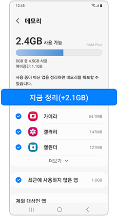 설정 > 배터리 및 디바이스 케어 > 메모리 > 지금 정리
