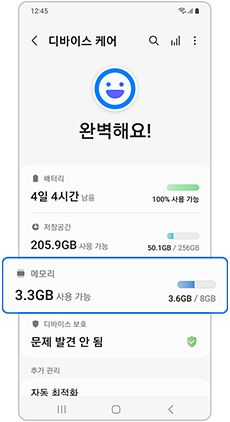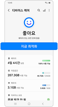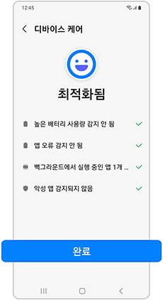 설정 > 배터리 및 디바이스 케어 > 지금 최적화 > 완료