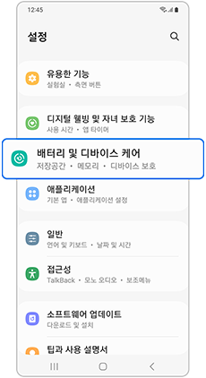 설정 > 배터리 및 디바이스 케어 > 자가 진단 > 휴대전화 진단/앱별 배터리 사용량 진단/앱 보안 진단