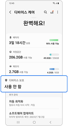 디바이스 케어는 휴대전화 성능과 보안, 배터리 수명과 같은 다양한 정보를 한눈에 파악하고,