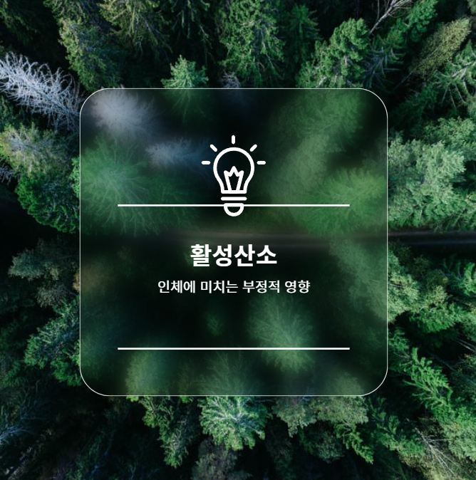 - 활성산소는 강한 산화력으로 세포 구성 요소(지질, 단백질, DNA)를 공격해 손상을 입힙니다. 이는 세포 기능 이상, 염증 유발, 유전자 변형으로 이어집니다.