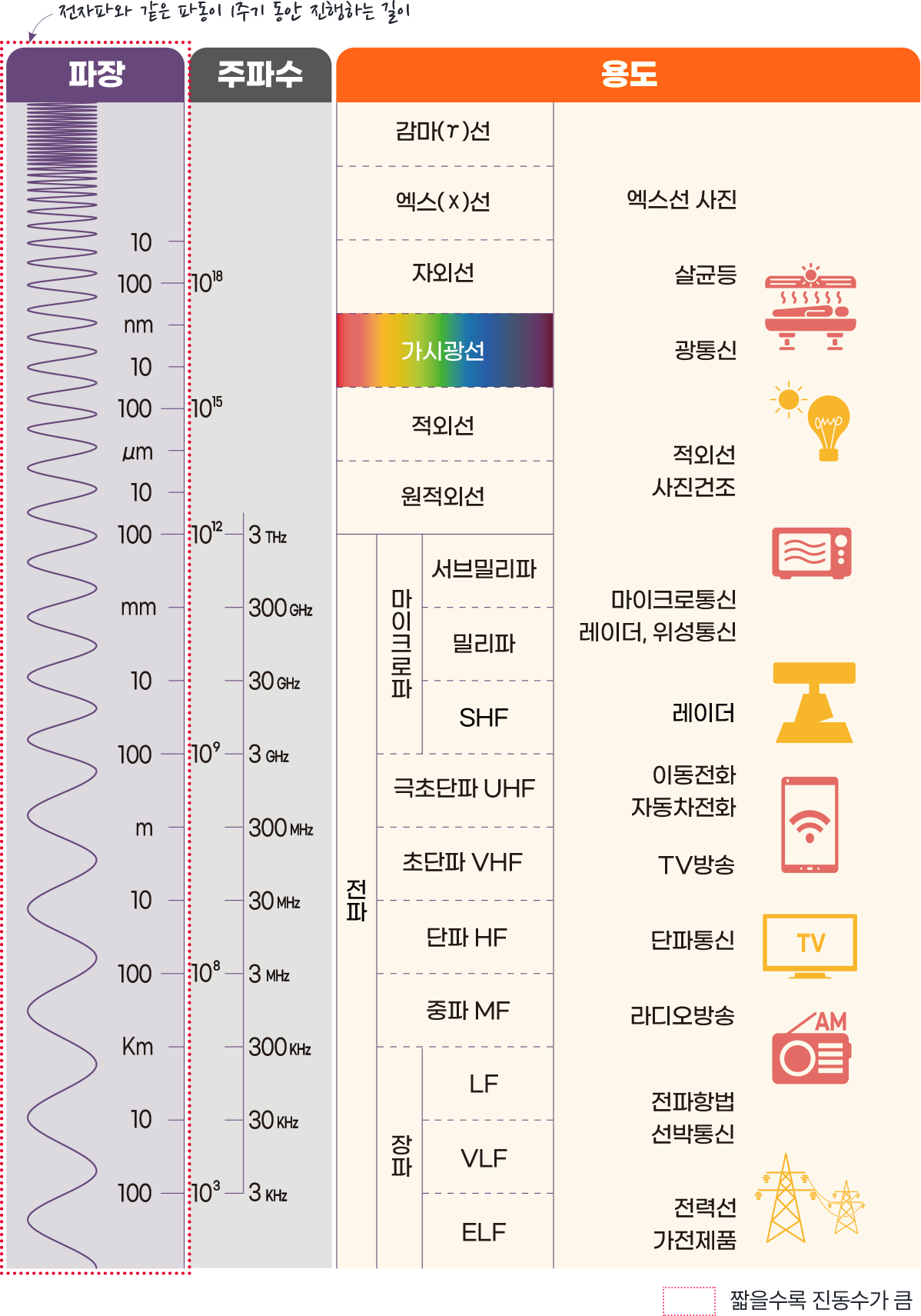 | 전파 | 수 km ~ 수 cm | 라디오, TV, 휴대폰 |