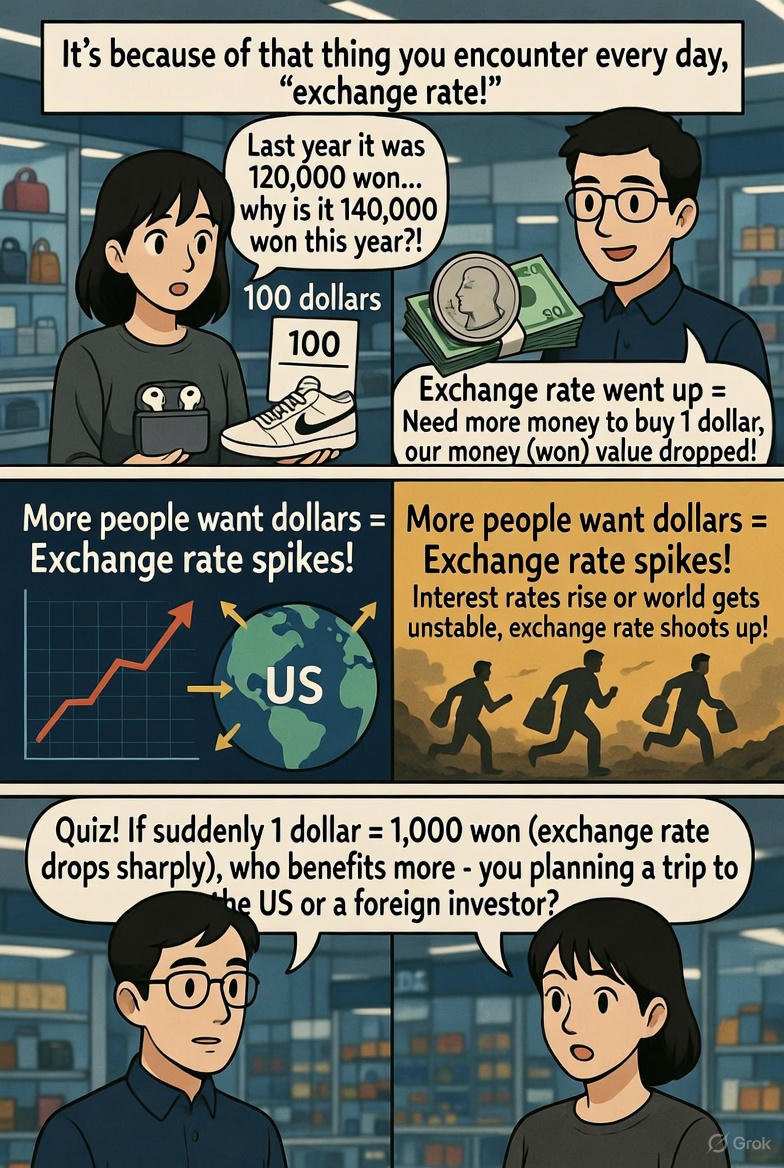 → 전 세계 돈이 미국으로 몰려 → 달러 수요 폭발 → 환율 상승